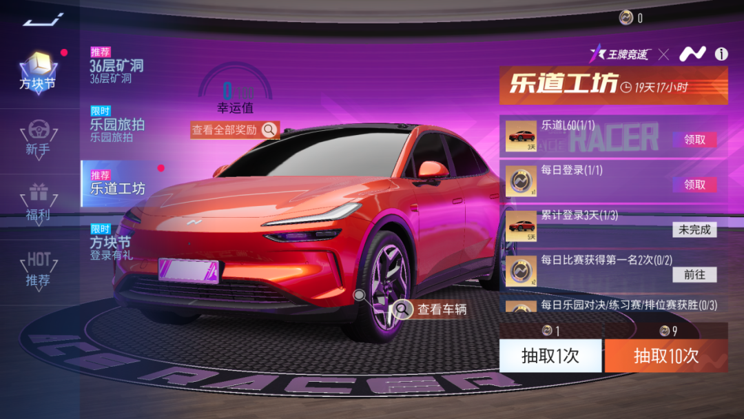活动期间,各位车手可以完成每日工坊任务就可以获得“乐道精品币”,参与抽奖每次都能增加1点幸运值,当幸运值达到100时,必得永久车辆-乐道L60。当车手们幸运值再次达到100,则必得奖励-乐道L60蓝图。
