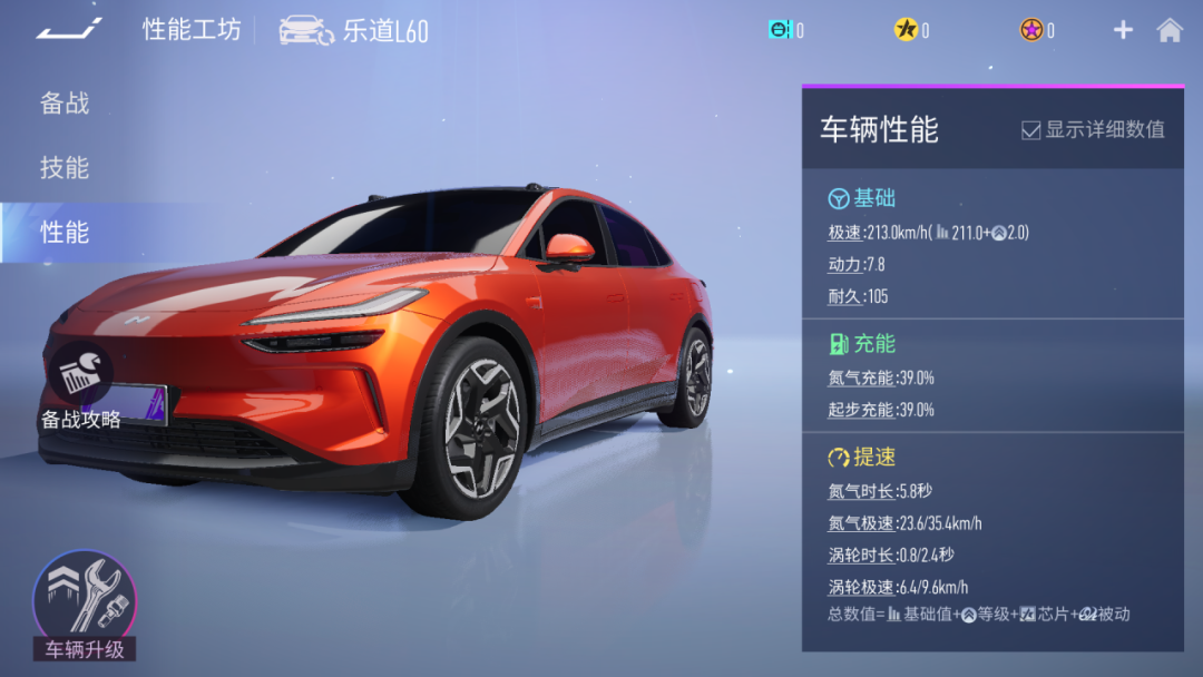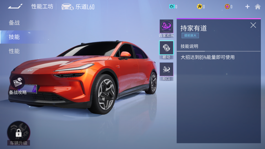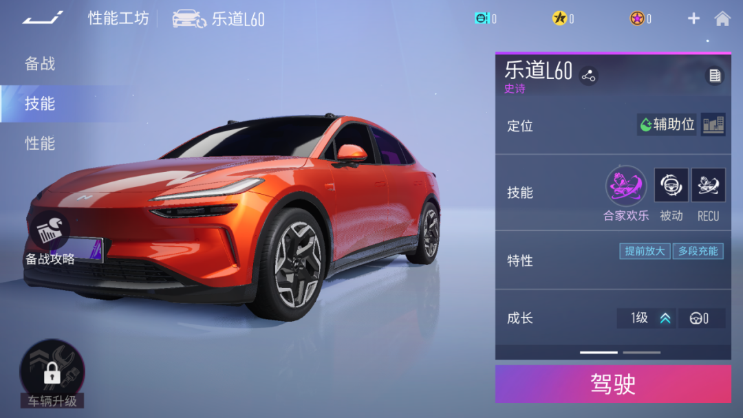 当车辆等级达到8级时,乐道L60王牌大招-合家欢乐,可以充能两次,下方为乐道L60车辆10级数值。