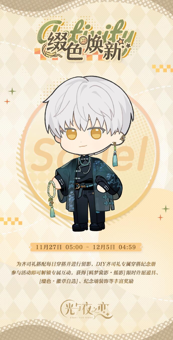 ①为齐司礼搭配每日穿搭并进行留影,DIY齐司礼专属穿搭纪念册,解锁全部穿搭留影,还可获得[齐司礼・缀色焕新]道具。