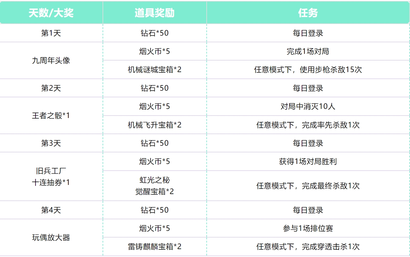 第5-7天的活动任务也不难,对各位CFer来说简直就是小菜一碟,大家可以点击下图自行预览。注意,这里把前4天的烟火币换成了角色洗炼单抽券,而且烟火绘谜城活动还会放送角色洗炼十连券,助你打造三防属性的零-新生!