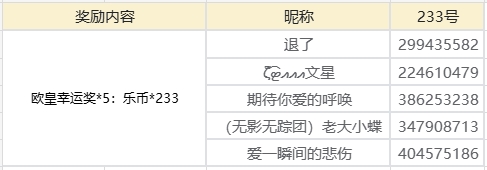 官方会从所有成功参回帖并附上分享截图的玩家中,随机在总楼层数中抽取5位玩家获得233乐币奖励