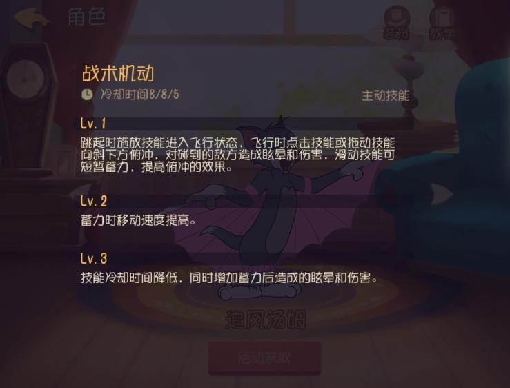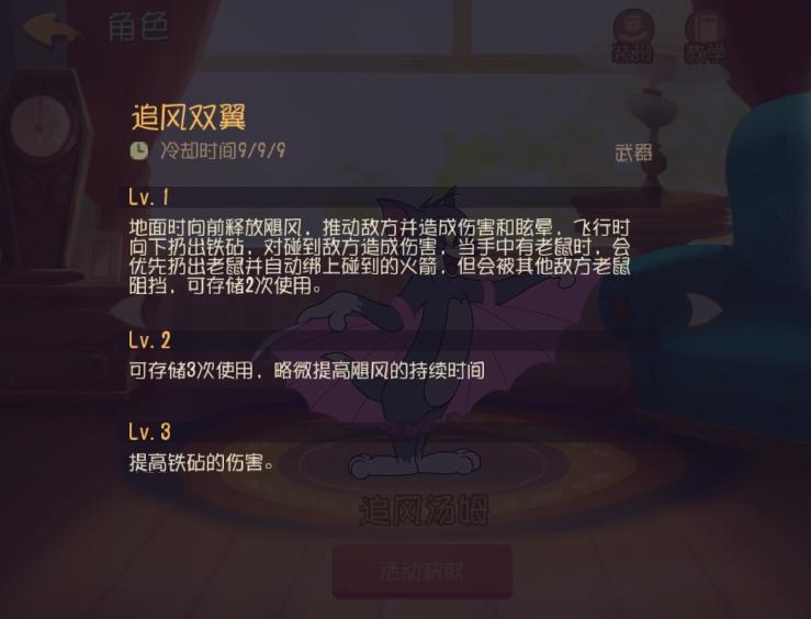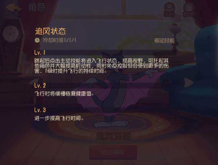 追风汤姆的飞行能力是很出众的 而且最主要的是主动技能飞行没有冷却时间 飞行消失后跳跃即可再次翱翔 还多了一个突出的技能 进行蓄力时伤害会更高 如果是老鼠推奶酪时候 远程蓄力然后突击像泰菲一样的就直接秒掉了 武器技能铁砧有控制作用 空投不稳定的话也可以贴着地面使用 有老鼠即可造成眩晕和伤害 飞行时候受到的伤害会变高 所以二级被动是很重要的 一级时候可以免疫控制道具 为追风汤姆的追捕奠定了基础