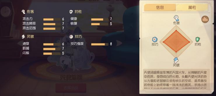 天使汤姆的技巧强度为8 在猫方阵营算高的了 因为主动技能操作起来比较麻复杂 攻击频率和范围偏高 抓捕能力也不差 天使汤姆唯一不缺的就是火箭了 多远的都能召唤过来 其他都是中规中矩