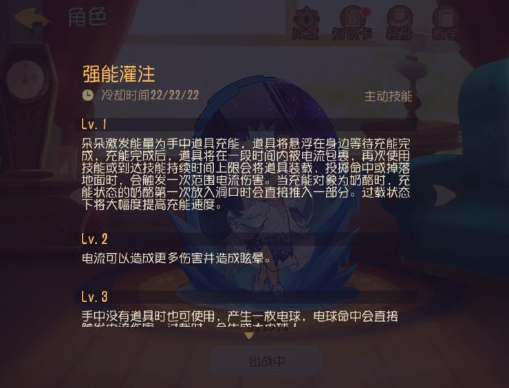 朵朵武器技能点击有加速状态 其次能量条变为黄色 切记不要让黄色能量条耗尽 快结束时候再次点击恢复即可 普通能量条立马充能完毕 过载阶段充能时间大幅减少武器技能正好能弥补朵朵的缺陷 在绿色快没的时候就点技能可以恢复 到红色就会在原地恢复 这是不免疫效果的哦强能灌注用了点武器技能就会减少时间 增加速度 但很快能源就会耗完 要合理使用 能量耗完可以喝牛奶和饮料恢复哦如果主动技能还在冷却救人的话3级武器也是可以的哦 只要在猫的旁边点技能就可以救下对了 猫也会被电到 减少1点健康值 (这个仅3级有限) 虚弱时跳出来的电池可以被队友捡起 扔向猫 会造成电击效果 救下队友
