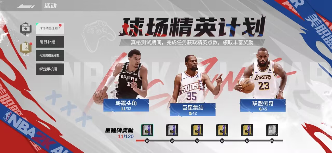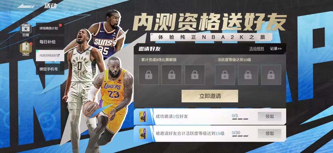 篮球,作为一项团队运动,玩家的NBA生涯不能没有队友!因此,游戏也为玩家准备了“内测资格送好友”活动。成功邀请好友,或者被邀请好友合计活跃度等级达到15级,大家都能收获额外奖励。站在NBA之巅时,不仅有你,还有你身边的伙伴!