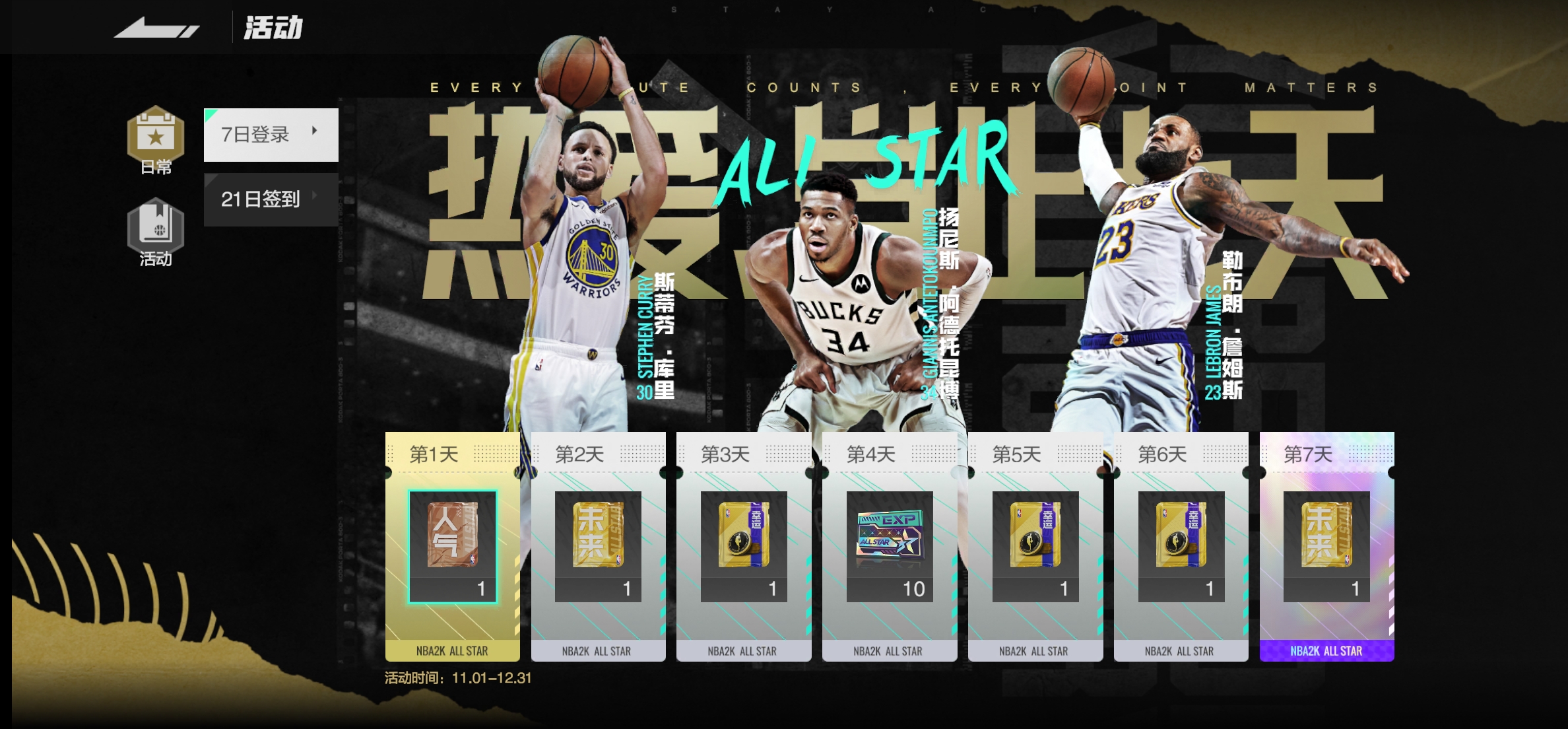通过7日累积登录活动,大家在“开荒期”就能获得大量实用资源,让你的NBA生涯更加顺利!