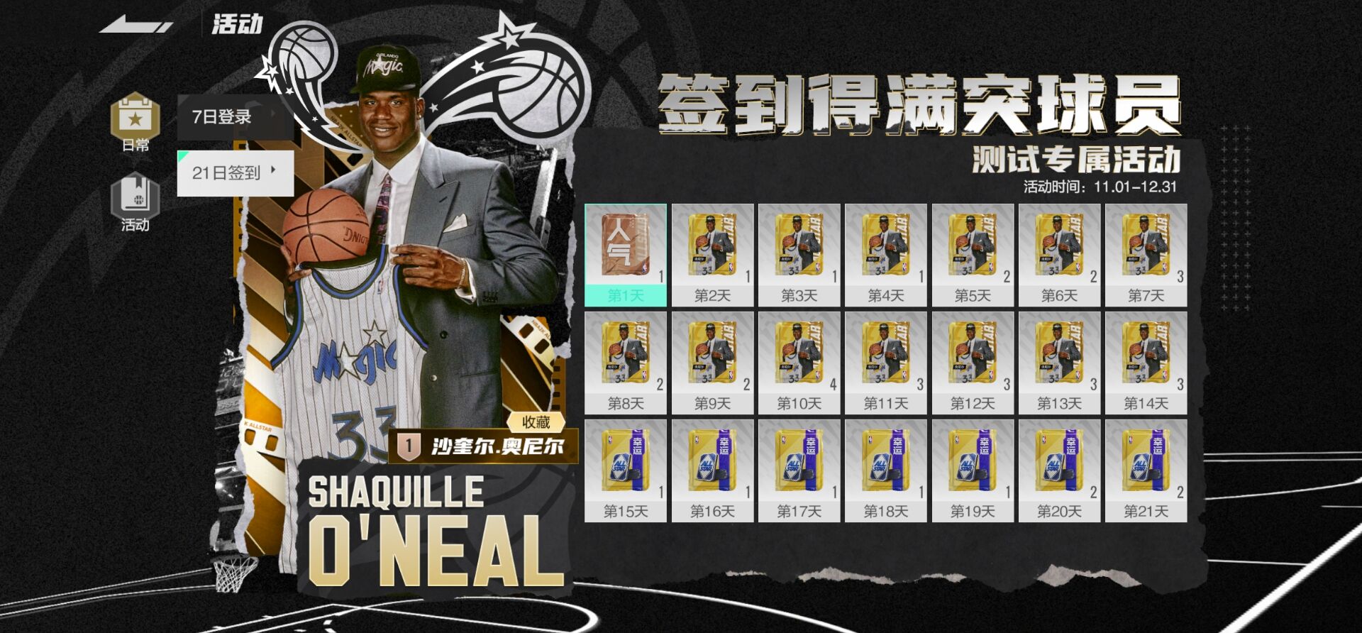 俗话说得好,要想打得好,球星少不了。而在《美职篮全明星》,签到就能获得人气收藏球星!通过“21日签到活动”,玩家每日签到即可获得一张【真格版】沙奎尔.奥尼尔,累计签到至14天,就能用获取的所有奥尼尔将“幼鲨”合至满突,拿到你的第一个内线大杀器!