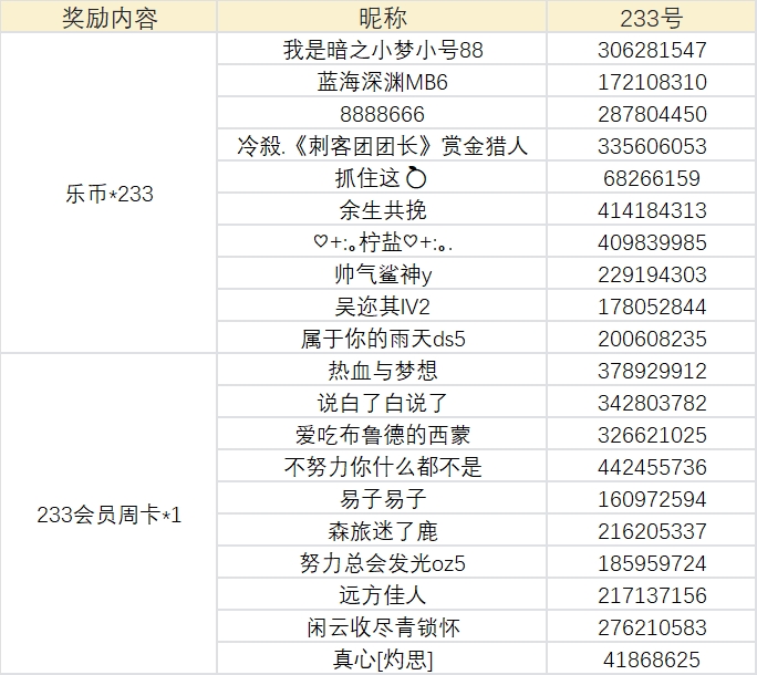 随机抽取10名玩家,每人送出233会员周卡1张!