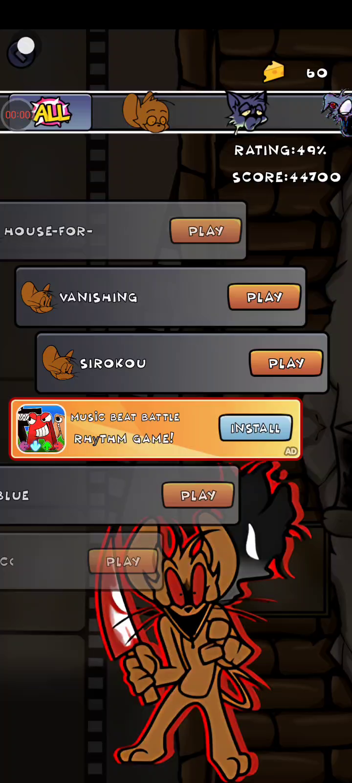 为了一个有趣的星期五,让我们与著名的猫和老鼠一起玩节奏。在这个令人毛骨悚然的地下室充满紧张和恐惧的一周中,男友将不得不与女友一起说唱。男朋友必须集中精力打败老鼠和猫。你想加入这个时髦的节奏吗?快来 FNF 故障地下室表演模组角色测试中玩得开心吧! 怎么玩? - 使箭头完美匹配。 - 打败猫和老鼠,爬到最高排名! - 感受芬金节奏!与 cg5 共舞! 有趣的功能 - 箭头跟随芬金旋律落下 - 杰瑞的歌曲和汤姆的音乐 - 惊人的音效 - 故事模式或自由泳 - 完整的模组 完整的敌人 - 梦幻般的背景和绝佳的音效 - 每个指尖下的 Funkin 节奏 - 新模组和新功能会经常更新! - 随时随地离线玩 你想加入我们,与他们一起以疯狂的小故障节奏跳舞吗?让芬金节奏让你疯狂