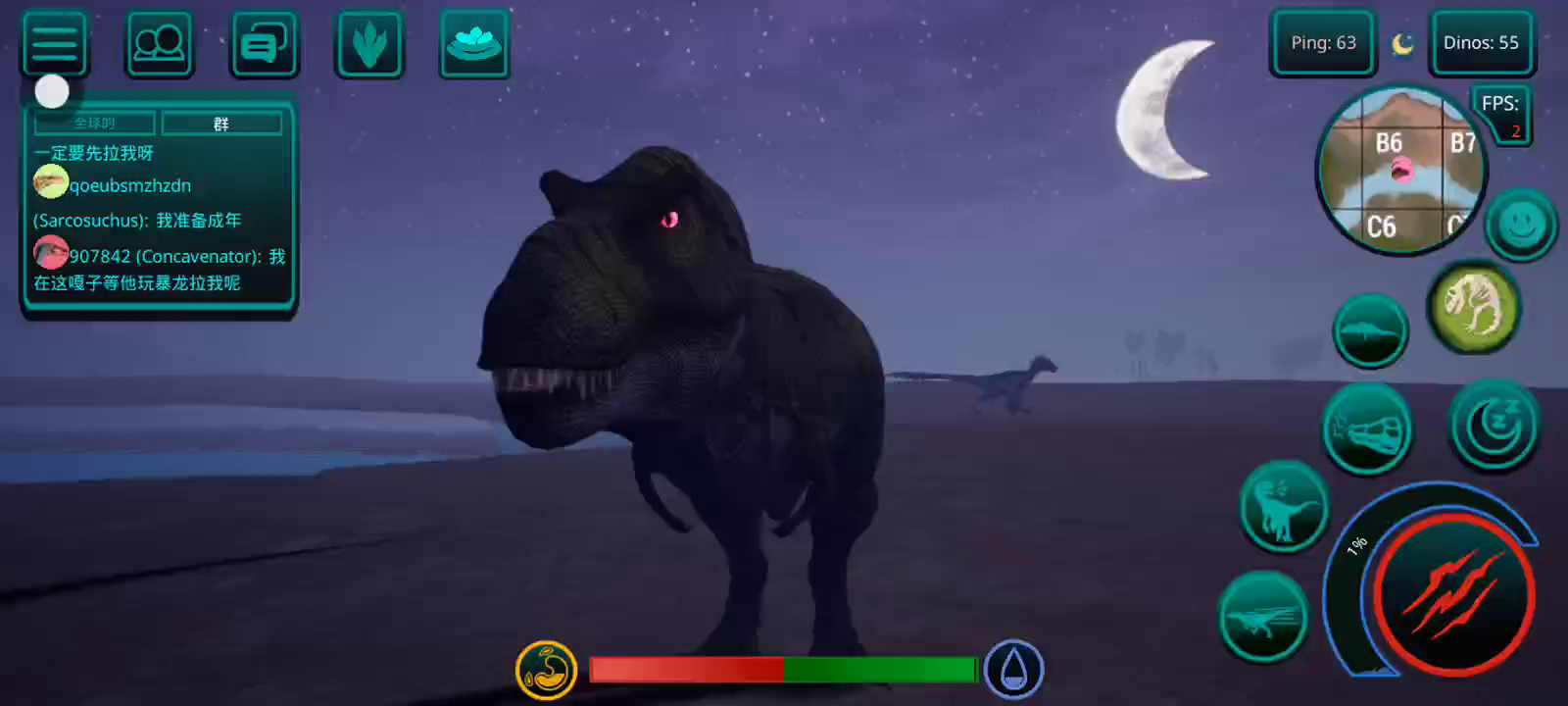 【更新:修复错误,提高稳定性】 恐龙岛是一款以侏罗纪世界为背景的逼真在线恐龙模拟器。 享受各种恐龙、逼真的图形和岛屿大地图。 选择你的恐龙并开始生存, 与您的朋友以及世界各地的玩家一起玩。 游戏中呈现了所有流行的恐龙,例如,从霸王龙、棘龙等食肉动物开始,到三角龙、甲龙等食草动物,游戏中有超过 23 种恐龙,包括飞行和游泳物种,以及所有恐龙。 如何玩诅咒岛 肉食性恐龙在线模拟器 - 恐龙生存和狩猎的游戏特色: 1.成长系统! 恐龙不会立即显得很大,需要照顾。 你需要培养他。你需要生存、寻找食物和饮料,并避免来自其他肉食恐龙(例如巨龙、重爪龙或暴龙)的潜在威胁。 2. 首先,玩家需要选择一种恐龙。 请记住 - 这是您个人的恐龙! 在恐龙游戏中,不仅有肉食性恐龙和草食性恐龙,还有会飞的恐龙,例如翼手龙,玩家可以与自己物种的食肉动物联合成群,以抵抗其他物种,最重要的是,生存! 3.食物提取,如果恐龙是掠食者,那么你需要杀死其他玩家的恐龙才能得到自己的食物,如果你是草食动物,那么食物就更容易了,你需要特殊的蕨类植物,你可以得到足够的他们! 地图上任意湖泊、水库都可以饮用。 4.文字聊天和好友系统。 您可以与世界各地的朋友和玩家聊天、制定策略、缔造和平等等。 并且还可以将玩家添加为好友,并加入到游戏的骨架中