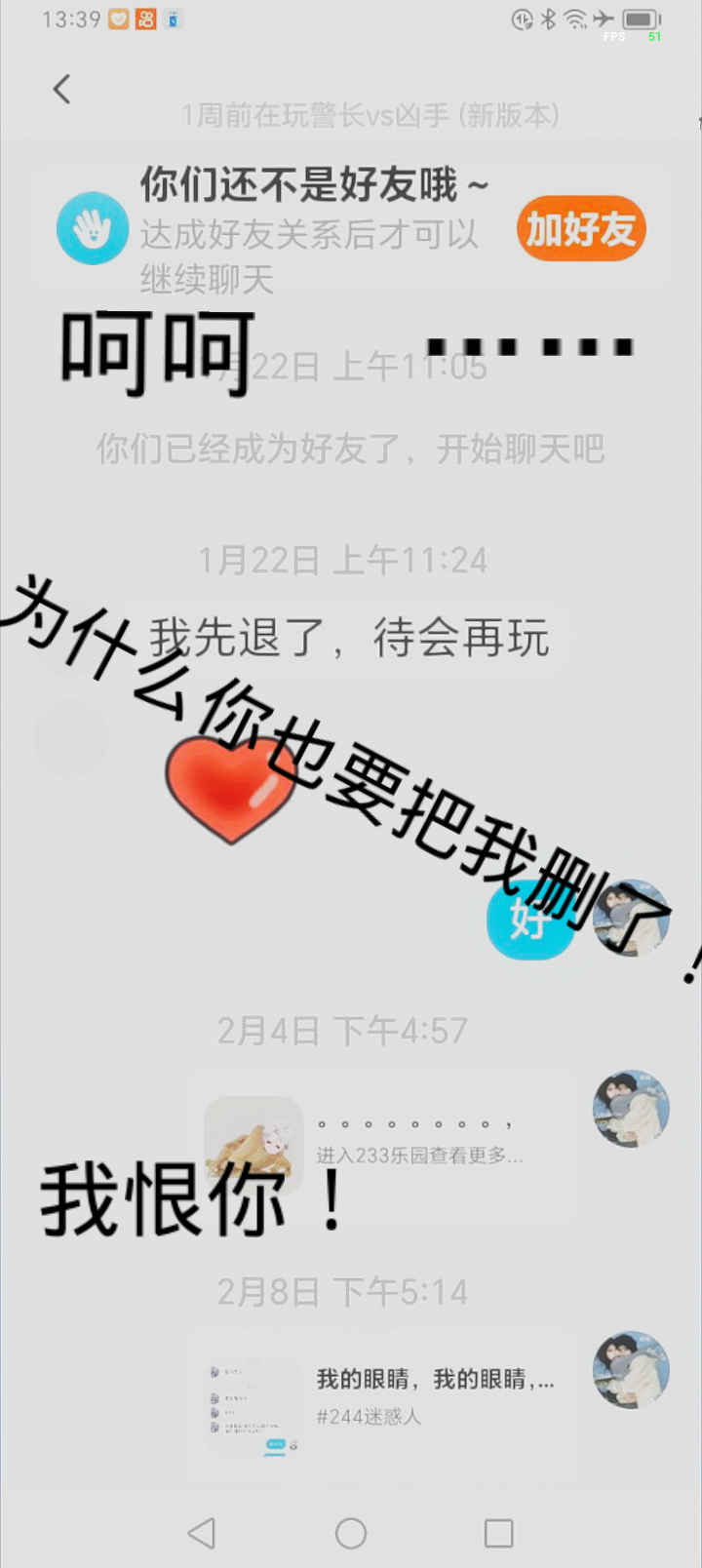 一个个好友都失去了……原来你也要把我删了…………呵呵 就当我们从来都没有相遇过 我恨你!😭