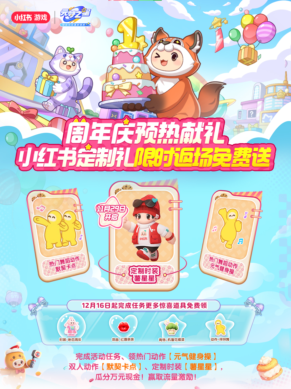 1、带话题#元梦之星 #元梦之星美食派对赛季 发布视频等任务获取积分,即可获得小红书定制时装-薯星星及热门舞蹈动作-青春舞、默契卡点等奖励。