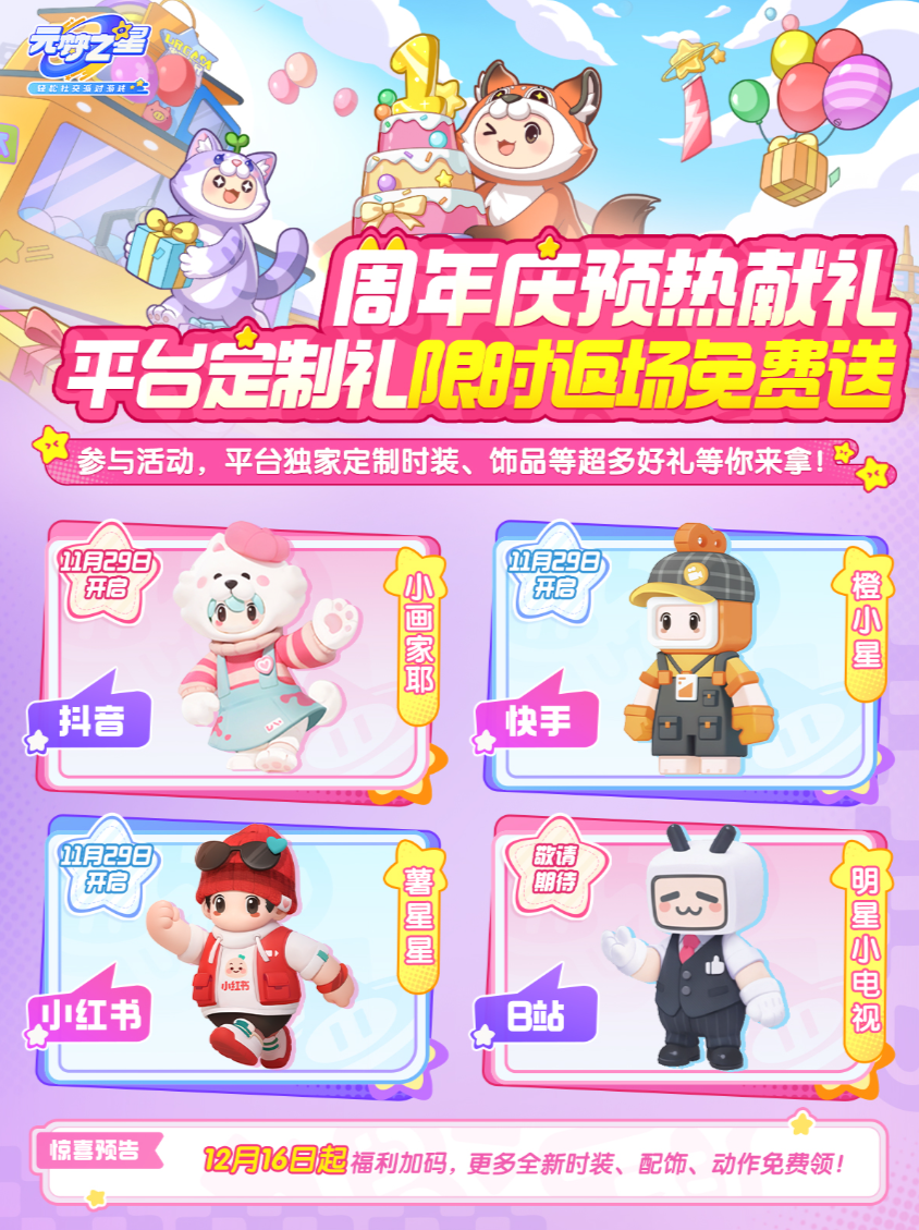 11月29日起,前往抖音、快手、小红书平台参加新赛季创作激励活动完成奖励任务,定制时装、饰品;现金激励等你来拿!