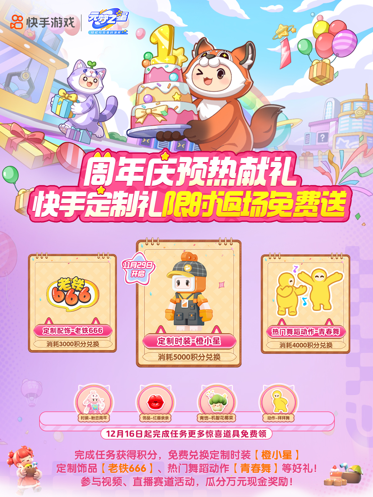 1、带话题#元梦之星 #元梦之星美食派对赛季 发布视频等任务获取积分,免费兑换快手定制时装-橙小星、定制饰品-老铁666、热门舞蹈动作-青春舞等奖励。