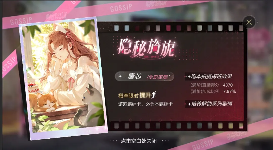 12月5日(本周四)更新后,“隐秘旖旎”活动卡池开启,【唐芯·全职家猫】【方昊·记忆烟火】开放获取,期待艺人们在娱乐圈里触发更多的独家回忆~
