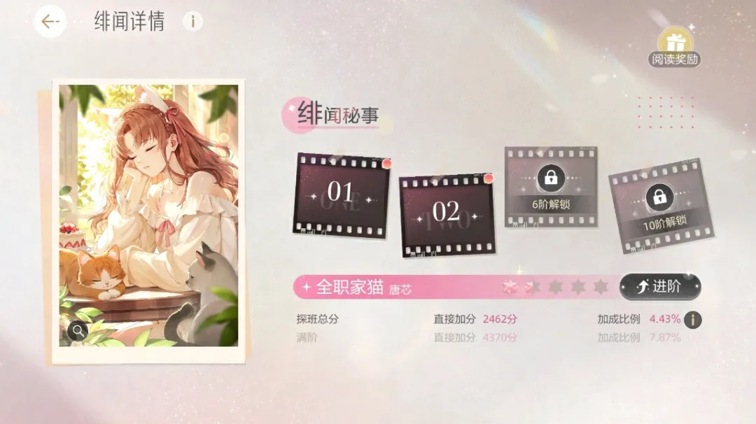 每张羁绊卡都有专属“绯闻秘事”剧情,分四段故事,阅读故事可获得对应的阅读奖励~