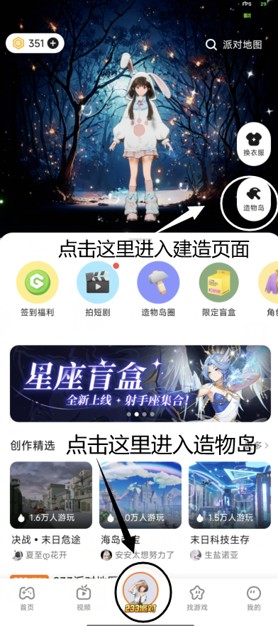 ·按照以下方式进入:233乐园首页-233派对按钮(屏幕底部中央)-造物岛按钮(屏幕中上右侧)-点击开始建造按钮。