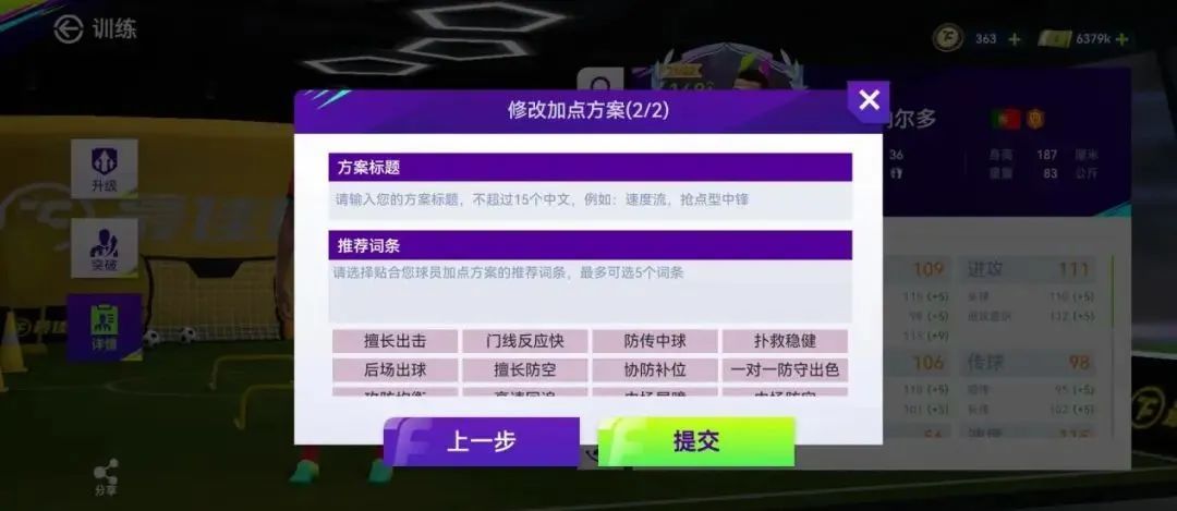 2. 系统推荐加点方案,系统会根据球员的高分属性、关键属性,推荐适合的加点方案与打法建议;
