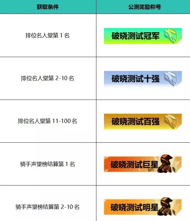 例:骑士A在12月5日结算赛季获得第7名,在结算前排位赛季获得第50名,则公测上线时将发放“测试赛十强”称号。