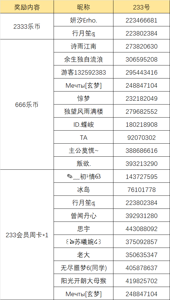 幸运奖:我们将从所有符合活动规则的回复中:随机抽取10名玩家,每人发放233乐园会员周卡*1!