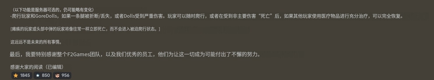 -如果玩家和人偶断腿/缺腿或受到重创,玩家和人偶可以爬行。玩家将可以随时爬行,或在非重大伤害 “死亡 ”后爬行,但如果其他玩家使用医疗物品进行了足够的治疗,则可以完全恢复。