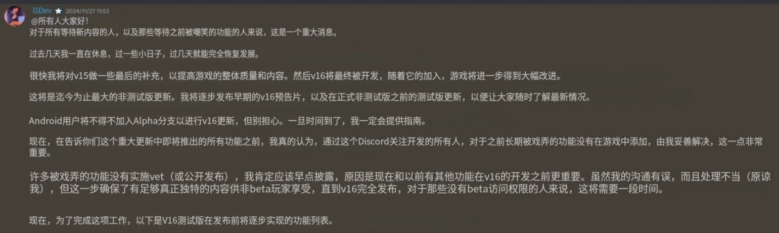 作者表示将对 v15 版进行最后的补充,以提高游戏的整体质量和内容。然后,v16 版将最终推出,届时游戏将得到进一步改进。