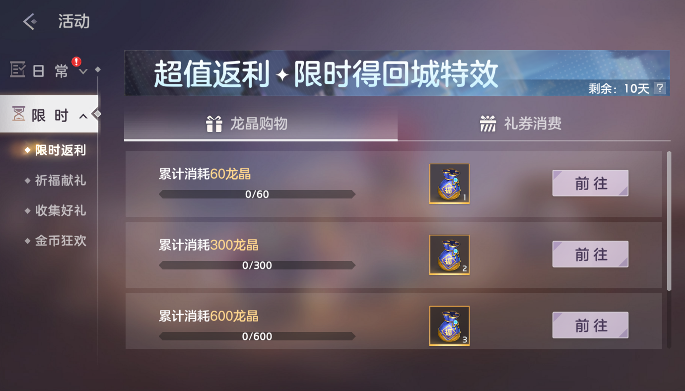 消耗龙晶可以获得甜心福袋,打开后有概率获得以下一件物品:甜心之礼回城特效、寻宝签、紫宝石、浓意之馨