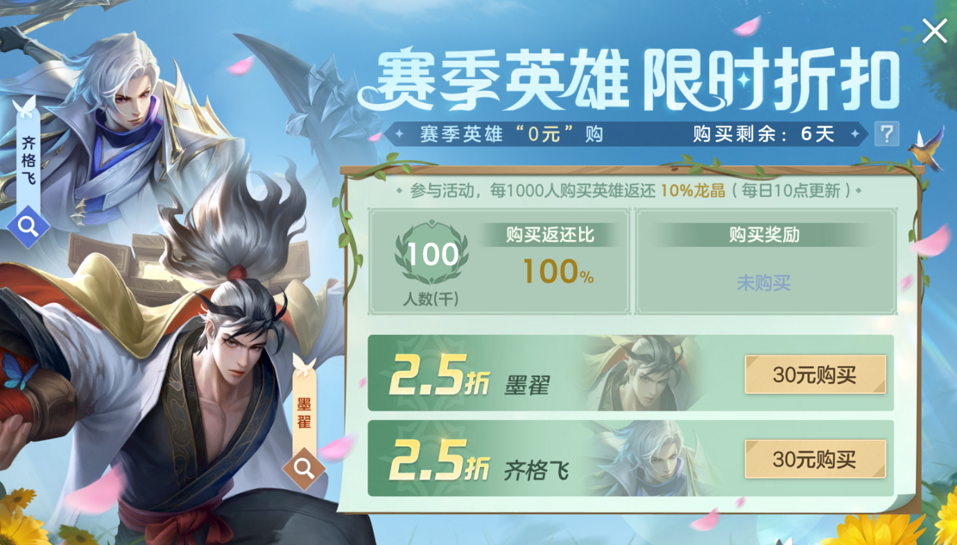 付费30元直接获得英雄齐格飞或墨翟,全服购买人数达到一定时,返还相应比例龙晶,最高每位英雄可返300龙晶~
