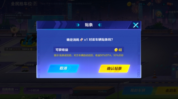 贴条玩法:车手们可以消耗贴条罚单,对停放在自己停车场的超时车辆进行贴条,贴条成功后,车辆将被自动召回,双方分别获得停车收益的50%泊车币。