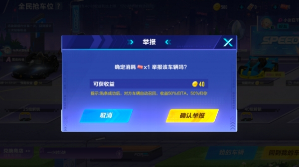 举报玩法:车手们也可以消耗举报卡,对他人停车场中其他车手的超时车辆进行举报,举报成功后,车辆将被自动召回,双方分别获得停车收益的50%泊车币。