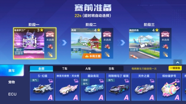 确认自己的王图后,进入到备战阶段,每一张赛道都可以提前选择不同的赛车、宠物、ECU配置,其中每辆赛车只能使用一次,宠物和ECU使用次数不限。车手们要根据不同的地图合理搭配赛车和宠物以及ECU才能将优势发挥到最大,这才是致胜的关键哦!