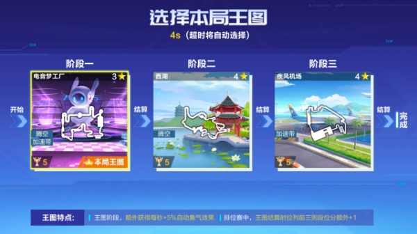 从三张随机好的赛道阶段中,挑选一张作为自己的王图阶段,在王图阶段行驶时,会有额外的buff加成,在王图中获得前三名,在排位赛中还会有额外的排位分加成哦!车手们要选自己最为熟练的地图作为王图哦,叠加buff会让自己更容易取胜!