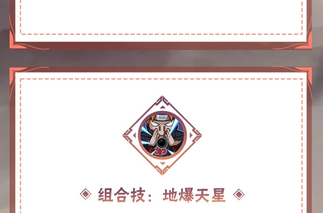 百战佩恩缓缓升到空中,释放出威力足以将一个忍者村夷为平地的超神罗天征,瞬间将周围的一切尽数毁灭。在中场使用时,奥义可全屏覆盖!