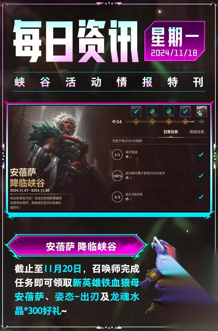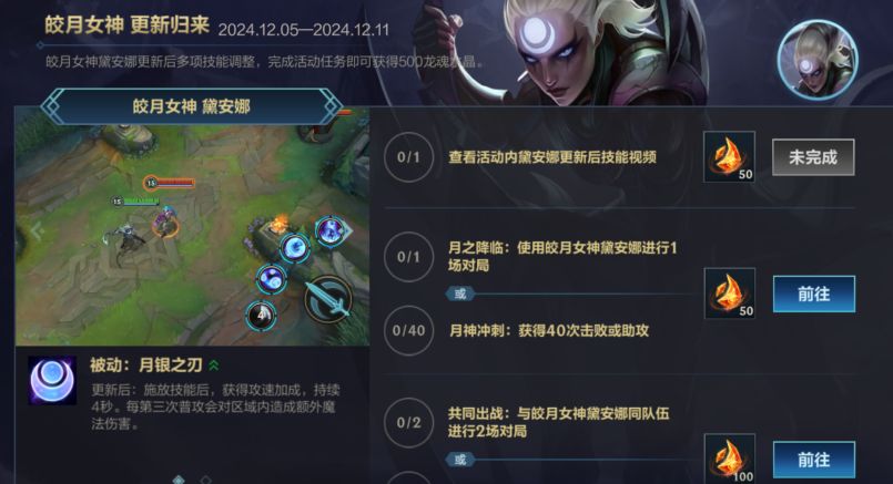 皎月女神 黛安娜更新后多项技能迎来调整。即日起至12月11日,召唤师完成活动任务即可获得龙魂水晶*500奖励~