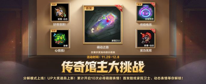 传奇馆主大挑战限时开启!截止至12月8日,分解模式上线,UP大奖道具上新,累计开启10次必得表情-心慌慌!,还有首发酷炫家园卫士、动态表情等你解锁~