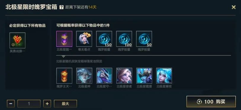 北极星限时魄罗宝箱也在同步热卖中!即日起至12月18日23:59,召唤师使用100点券开启宝箱,即可获得英勇战旗-金牛战旗(1天),还有机会获得北极星随机皮肤宝箱、局内表情-毫无看点和魄罗能量好礼~