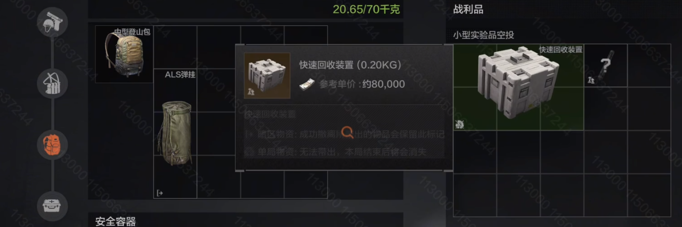 在小型实验品空投中概率获得后,将快速回收装置放在空地上,等待30秒启动装置,内有2X2的空间供先锋放置物品,回收后的物资可在对局结束后通过邮件领取。