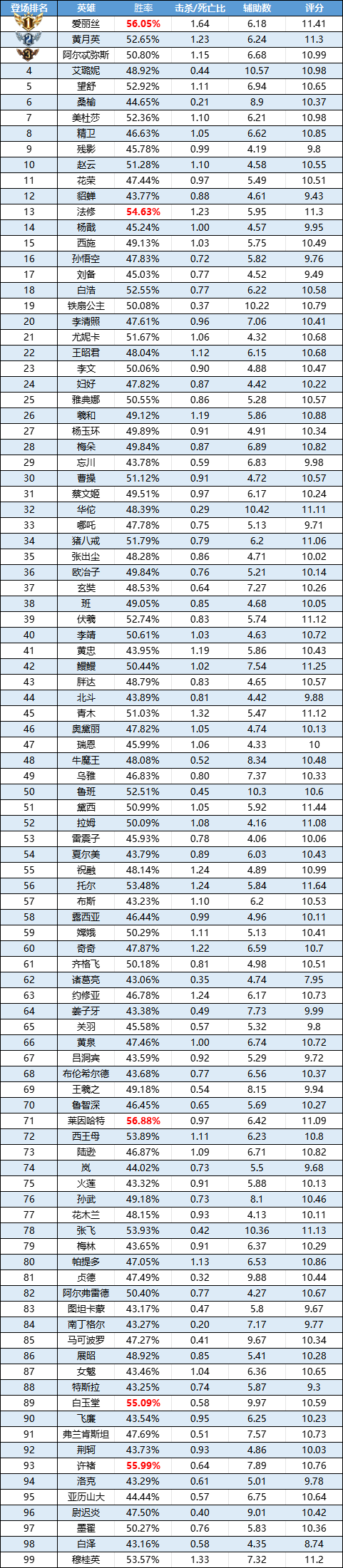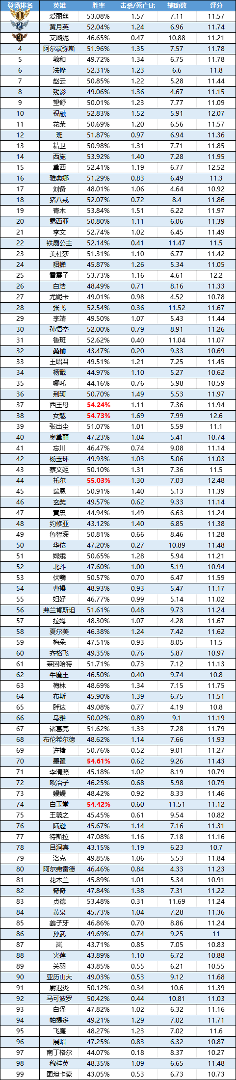 排序:按登场率高低进行排序,标红为胜率前5