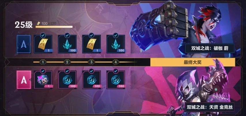 截止至12月7日,召唤师完成任务提升等级,即可领取免费线中双城之战:破枷 蔚皮肤等奖励。此外,召唤师还可解锁付费线,获取双城之战:天资 金克丝皮肤等奖励!召唤师们记得抓紧去完成任务领取皮肤大奖噢~