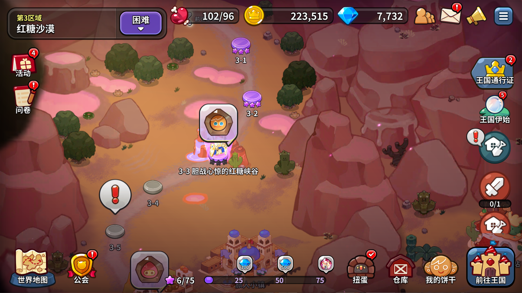 副本受限于体力,主线推完第四章,困难就只能刚推进第三章。先推主线解锁热气球探险的地图,再推困难。