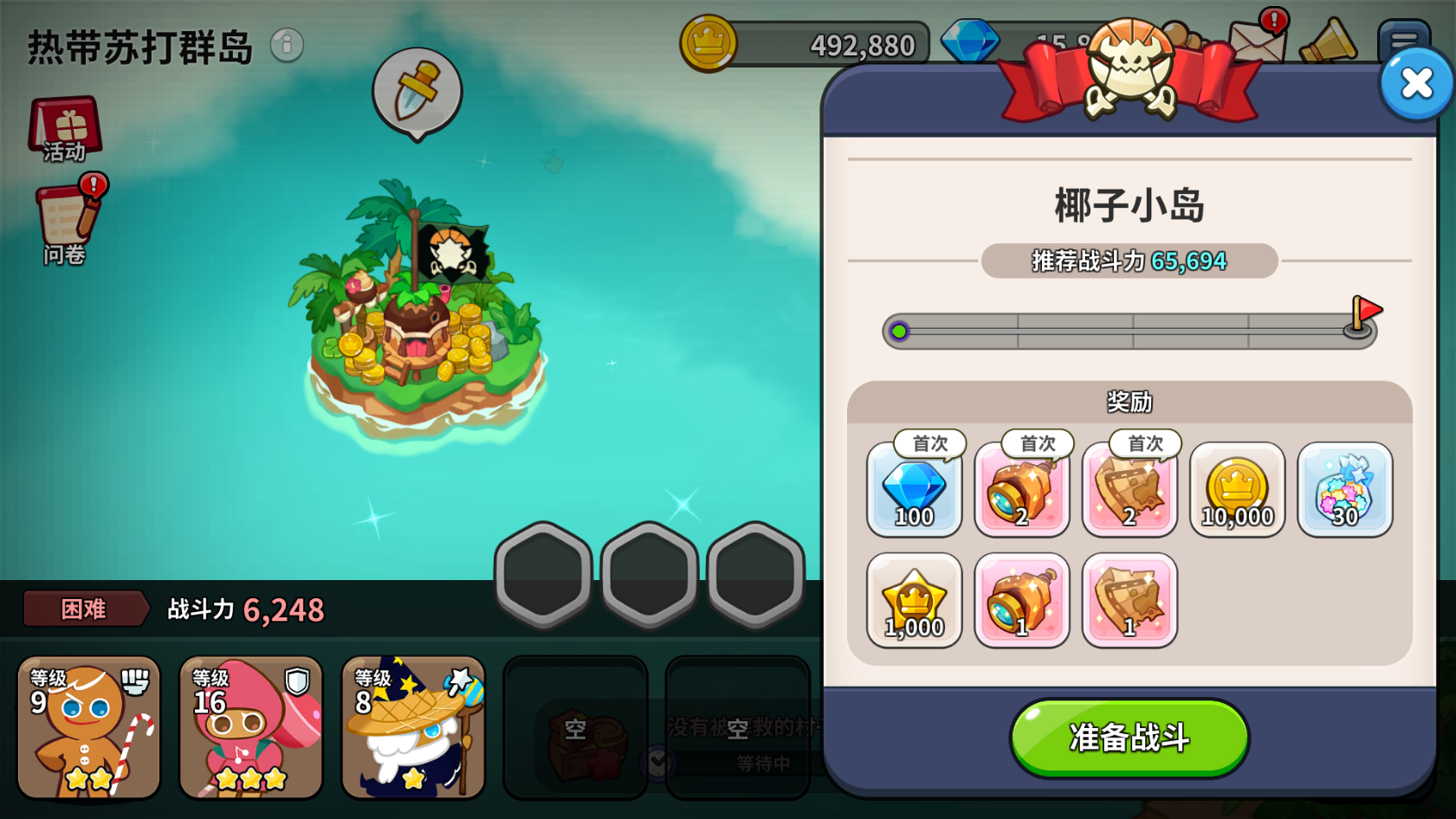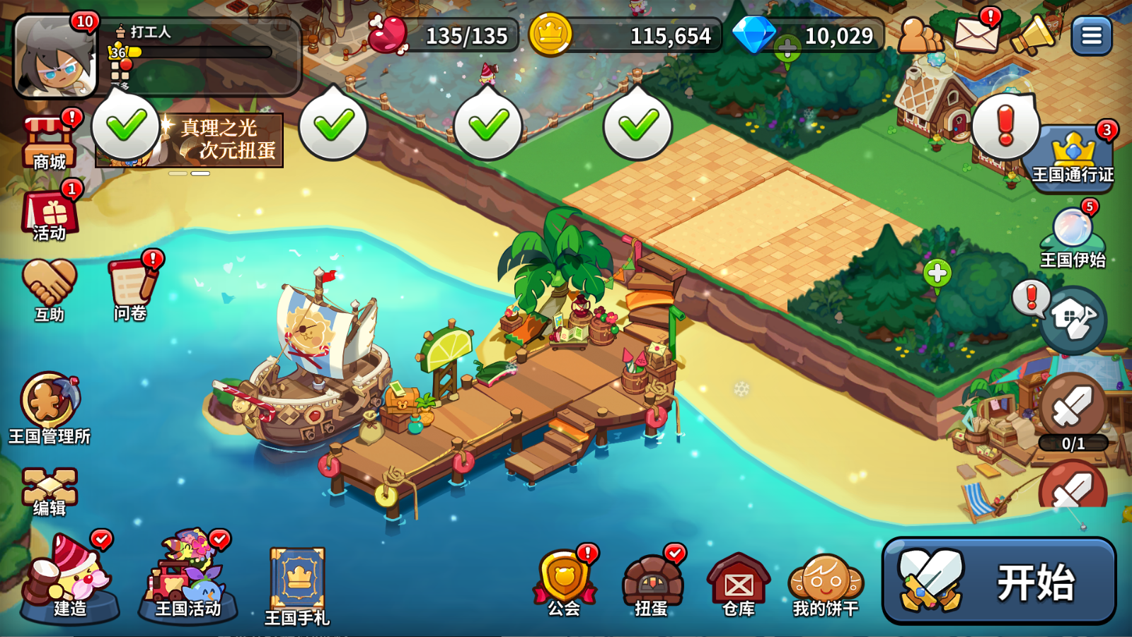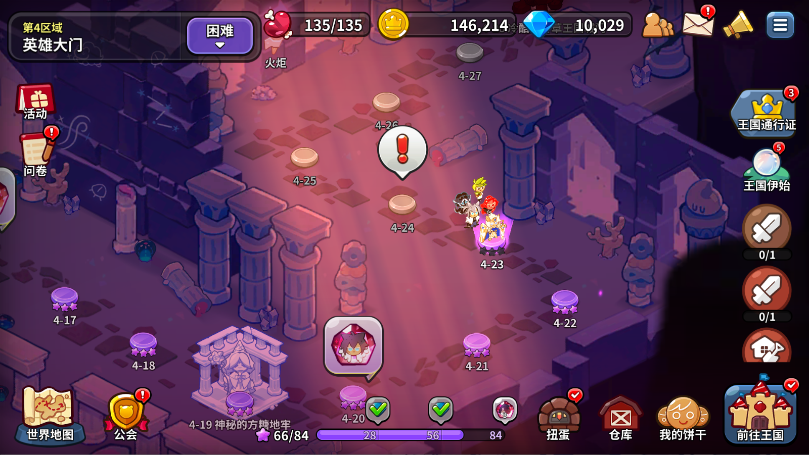 游戏第四天,当前版本的主线剧情可以推到头,也就是第六章完全通关,困难本可以推到第四章快推完的位置,受限于体力推进不了更多。人物等级能到36,饼干等级同步。城堡等级可以6升7,但因为需要15个小时的升级时间,不一定能在当天就升完。