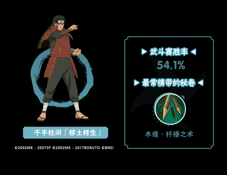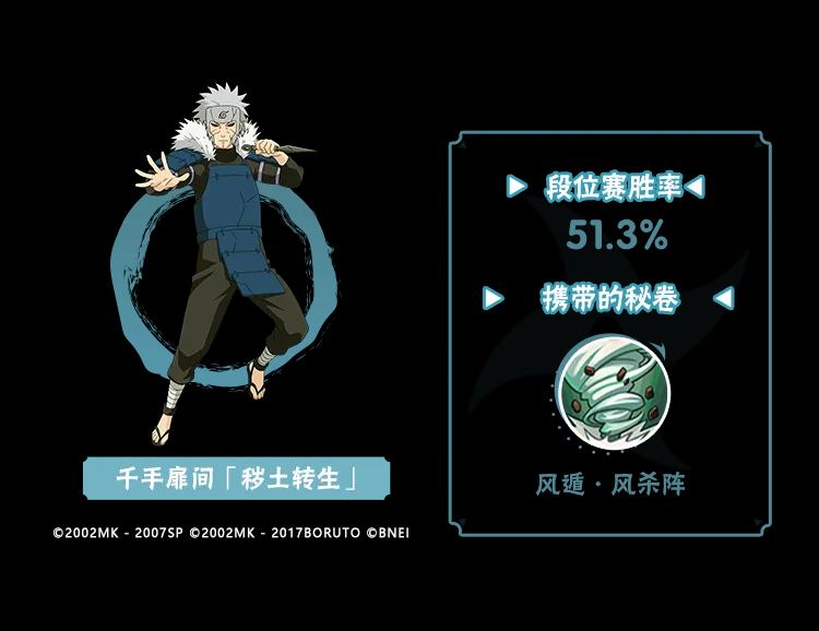 千手扉间「秽土转生」携带风遁·风杀阵可以提高对空和压场能力。11月大版本更新中,秘卷风遁·风杀阵缩减了冷却时间、增强板边反手能力,一定程度上让秽土扉间也随之受益!