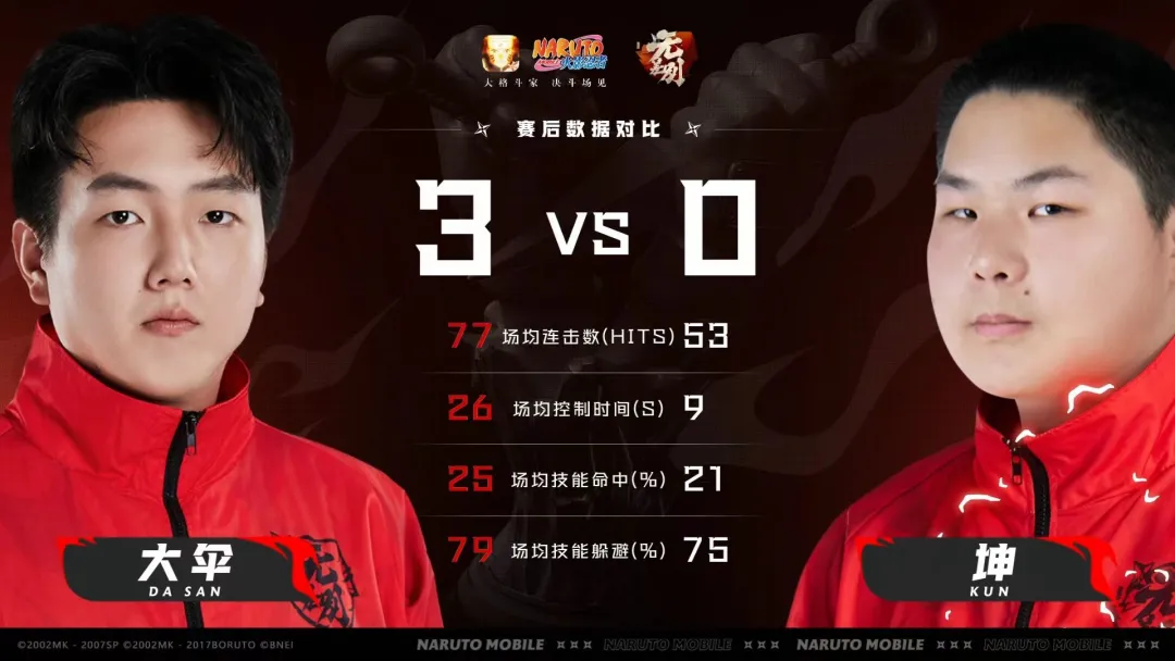 第四轮第1场,大伞对战坤。第一局大伞的金·槌多次技能先手并反手成功,连续击败坤两名忍者拿下胜利。第二局大伞的犬塚牙「新春限定」巧妙走位避开攻击并且抓到坤的地陆,之后轻松完成穿三再胜一局。第三局大伞的宇智波佐助「新春限定」,多次起手并且走位骗替成功,将坤打至无奥义点,最后再次穿三获胜,大伞3:0坤晋级年度总决赛!
