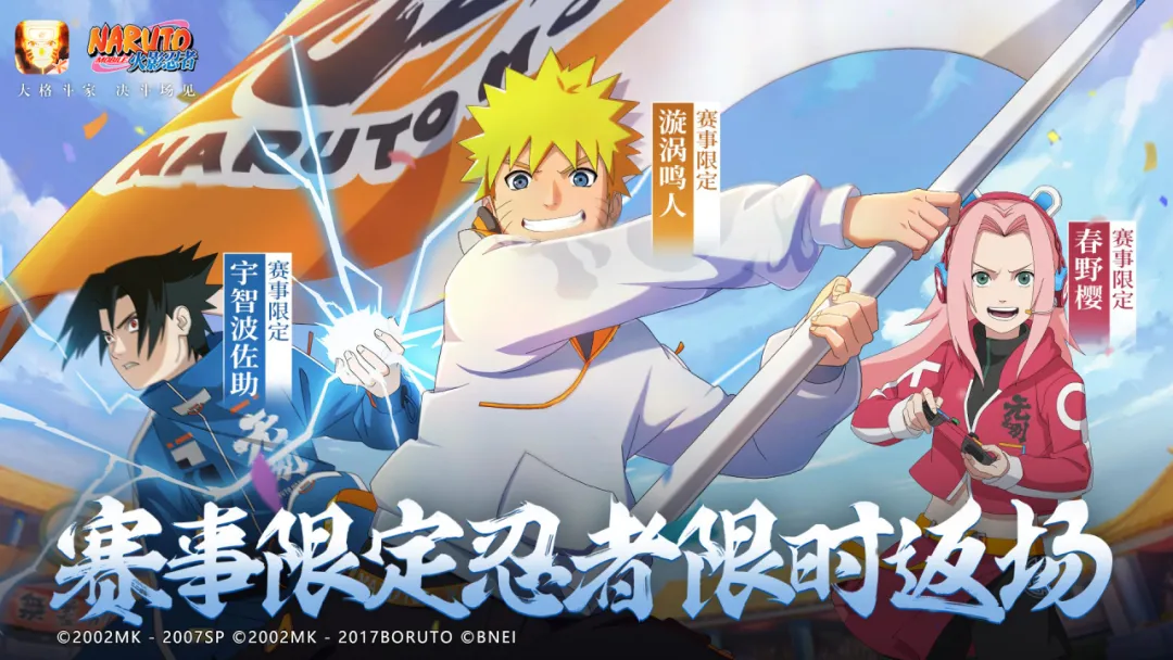 赛事期间当然少不了赛事限定忍者!11月29日12:00-1月12日12:00期间,漩涡鸣人「赛事限定」、宇智波佐助「赛事限定」、春野樱「赛事限定」限时返场!学员们和鸣人、佐助、小樱一起,为比赛应援吧!