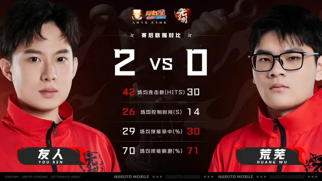 第二轮第3场,友人对战荒芜。第一局荒芜的宇智波佐良娜骗取友人的宇智波止水「忍者新秀」技能未果反被抓到走位,友人在残血状态下反杀,惊险获胜。第二局友人逐渐掌控节奏,连续击败对方两名忍者,之后友人操控长门「秽土转生」释放修罗之攻直接带走荒芜的艾「三代目雷影」,最终友人2:0荒芜获得胜利!