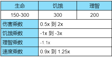 他的生命值上限会由 200 点下降至 150 点(在 0 点饱食度时),且他的攻击倍数会根据饥饿值落在 0.75 到 0.5 倍之间。