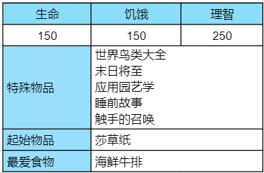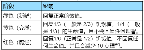 她也讨厌腐烂的食物,在吃腐烂的食物时理智值会大量的扣减。进食变质的食物不会减少她任何的理智值,但也不会增加。变质的食物也会比同种类的新鲜食物回复较少的饥饿值及生命值。