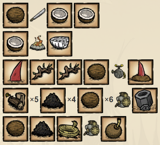 玩家可以对椰子使用砍刀来获得2个劈开的椰子,而劈开的椰子则可以被放在火上烤熟来获得烤椰子。两种状态的椰子都可以直接食用或者放入烹饪锅烹饪,提供1点水果度。野猪们会接受玩家给予的所有状态的椰子,但并不会产出粪便。