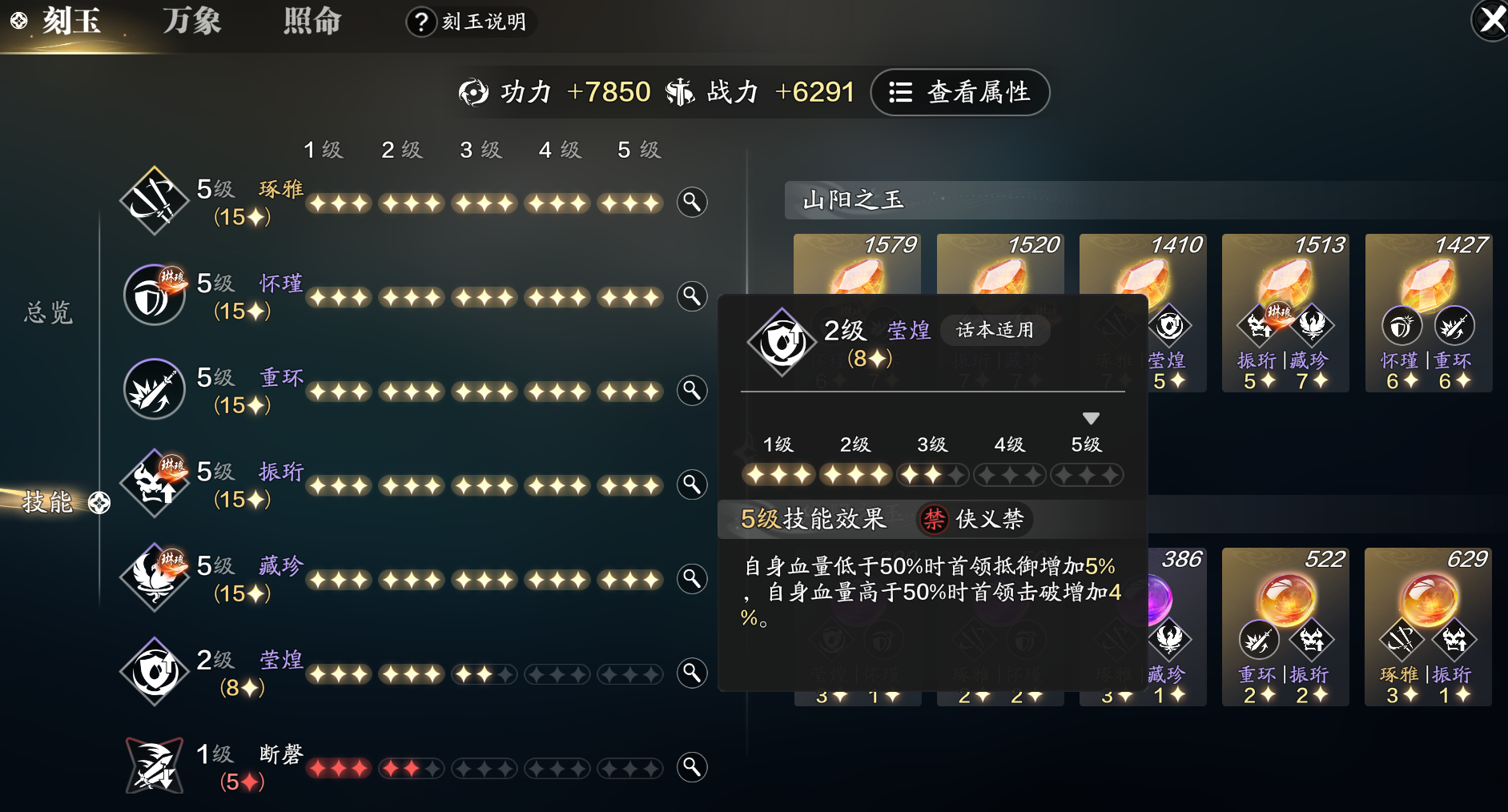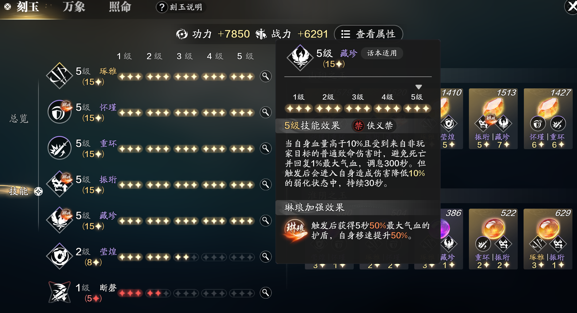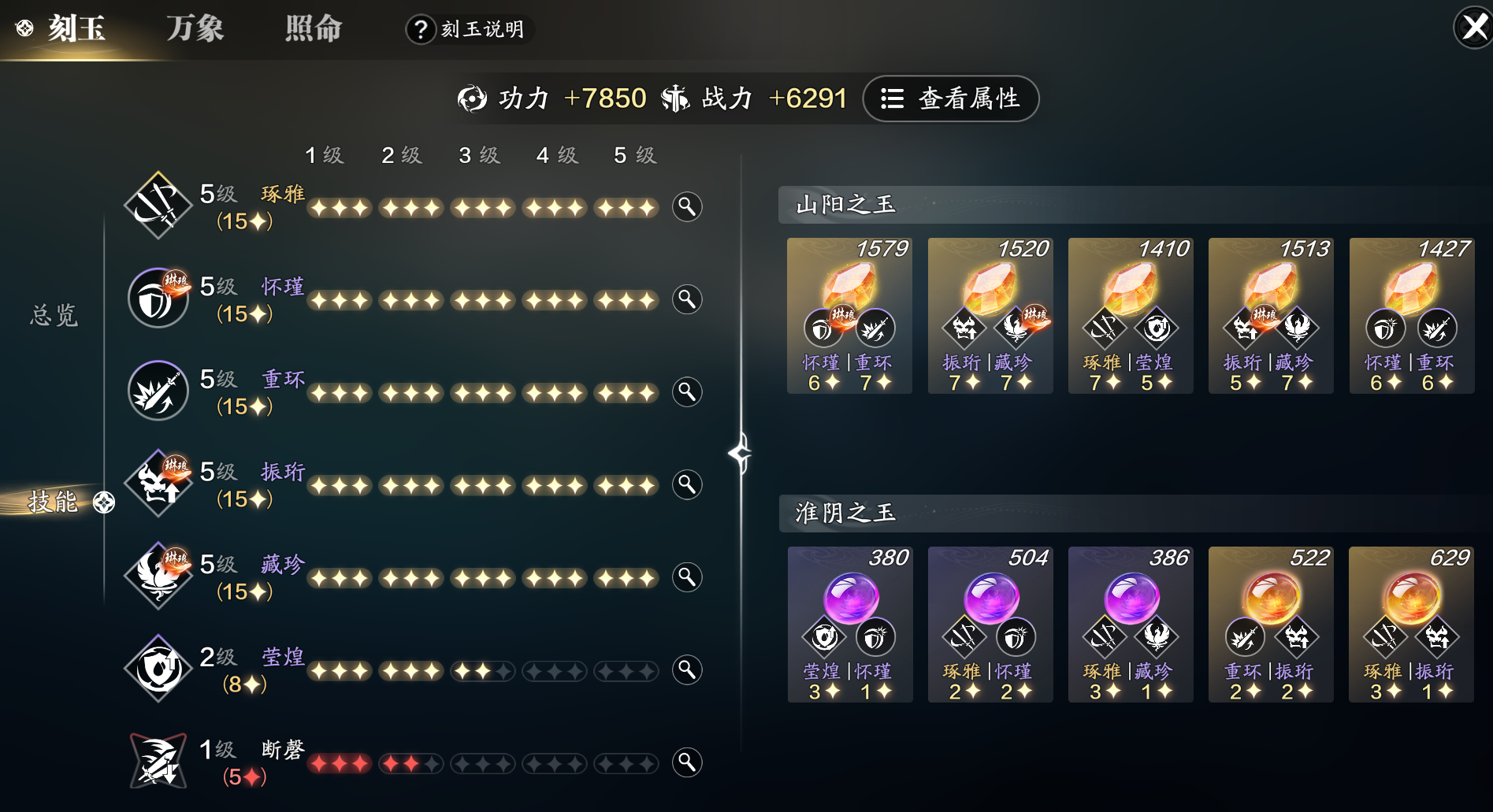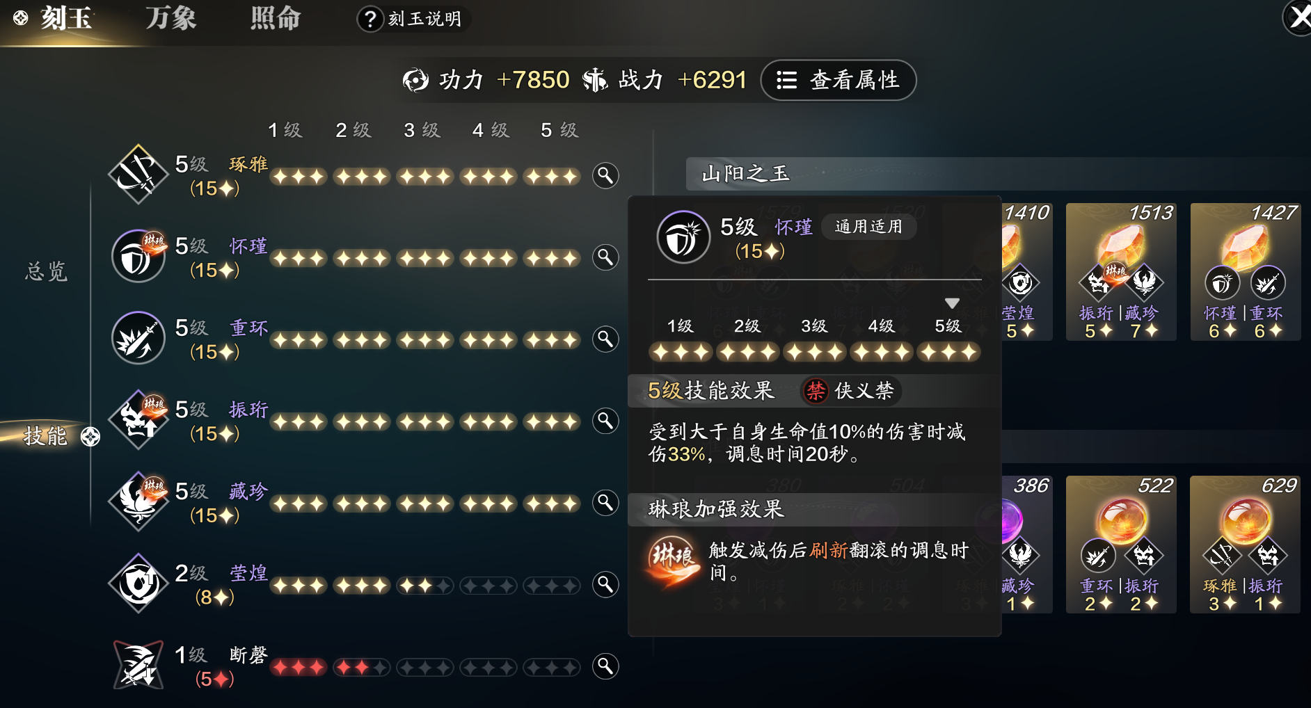 但是由于小编的阳玉藏珍与怀瑾的星级比较高,比较容易凑齐满级,并且带有琳琅效果,所以就选择用阴玉补齐了这两个。