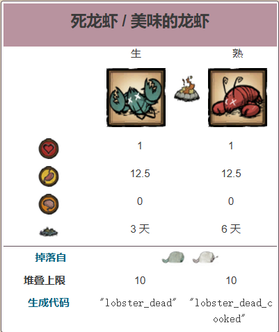 死龙虾(Dead Wobster)是右键物品栏中的龙虾的产物,可以被放在火上烤熟,但不能被放入烹饪锅中。
